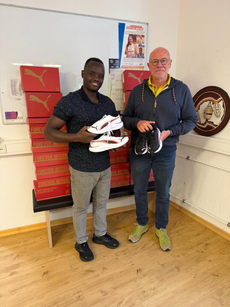 ohn Peter Ndacyayisenga von der Rwandan Athletic Federation und Hans Tilly vom Silvesterlauf Trier – sprechen PUMA ausdrücklich ihren Dank aus.