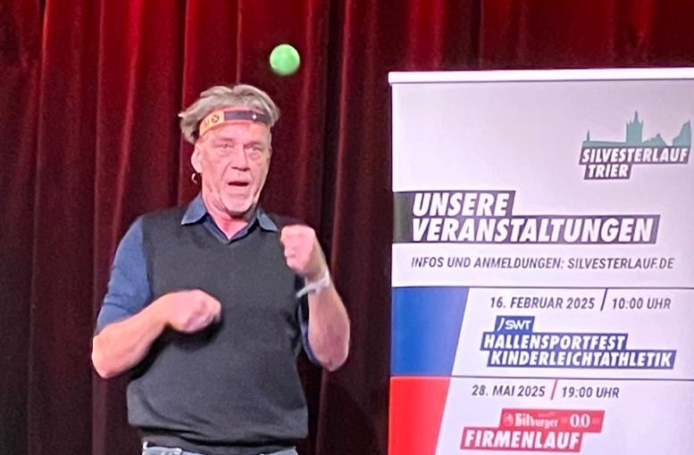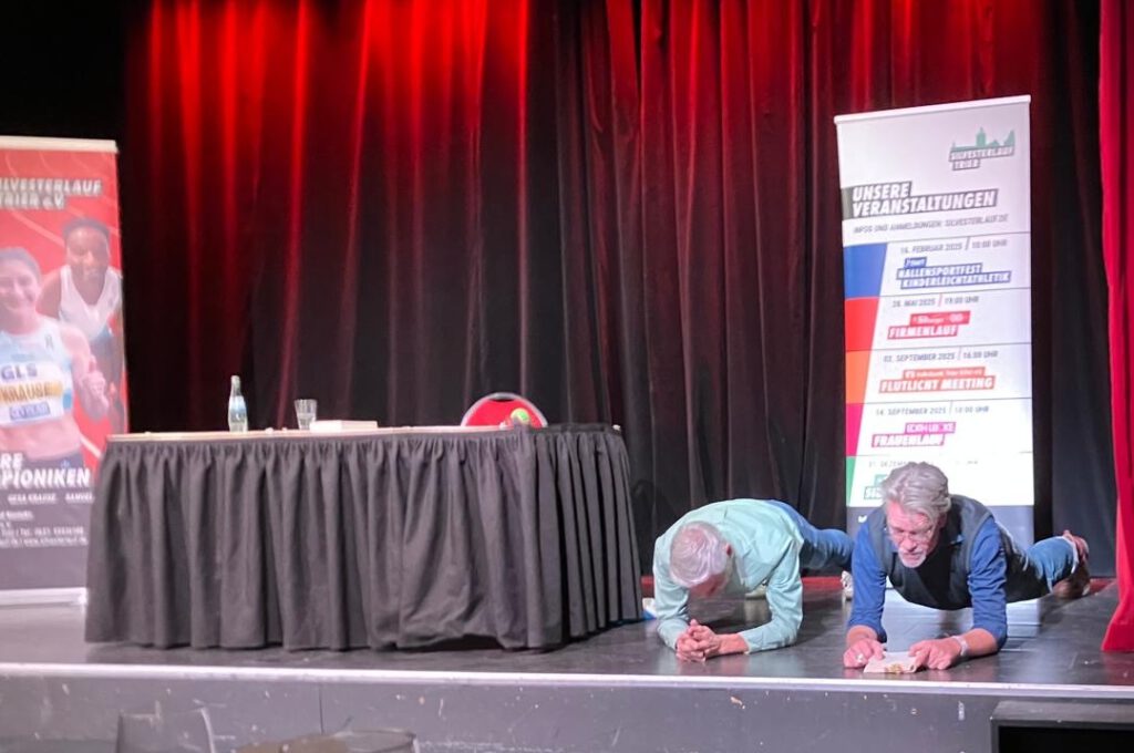 Diese Gelegenheit ließen sich Irina und Vanessa Mikitenko nicht entgehen: Wenige Stunden, nachdem die Tochter der deutschen Marathonrekordlerin am vergangenen Dienstag als Neuzugang des Vereins Silvesterlauf Trier vorgestellt worden war, besuchten beide die “brutal lustige Lesung” von Hajo Schumacher, vielen in der Laufszene besser bekannt als “Achim Achilles”. Im Kasino am Kornmarkt las der Autor aus seinem neuen Kriminalroman “Lügen haben schnelle Beine”, immer wieder unterbrochen von humoristischen Einlagen. Den Nachweis seiner Reaktionsfähigkeit trat Schumacher im Stirnband-Boxen (“Boxreflex”) an und hatte Lacher wie Bewunderer auf seiner Seite. Beim Boxreflex geht es darum, einen per Gummiband an einem Stirnband befestigten und immer wieder zurückschnellenden Tennisball reaktionsschnell wegzuboxen. Auch in einem Plank-Duell mit einem Freiwilligen aus dem Publikum bewies der 60-Jährige seine Fitness: Lesenderweise brachte Schumacher es auf mehrere Minuten in der starren Position der aktuell sehr populären Rumpfkräftigungsübung – abgestützt nur auf Fußspitzen und Ellbogen in waagerechter Körperposition..