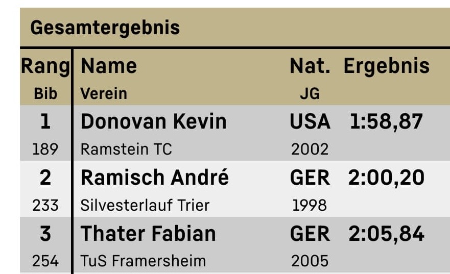 Der Ausflug nach Bingen am Rhein hat sich für Andre Ramisch und seine Schützlinge gelohnt: Das Trio vom Verein Silvesterlauf Trier kehrte mit drei persönlichen Bestzeiten von der Bahneröffnung des LC Bingen an die Mosel zurück: Trainer Ramisch ging mit gutem Beispiel voran und lief über 800 Meter so schnell wie nie zuvor – und das nur drei Wochen nach seinem Gewinn der Mannschafts-Silbermedaille im Marathon: Bei 2:00,20 Minuten blieb die Uhr stehen für den Trierer, der im Männerrennen nur dem US-Amerikaner Kevin Donovan (1:58,87) den Vortritt lassen musste. Für Ramisch bedeutet das eine Verbesserung seines bisherigen Hausrekordes um 1,54 Sekunden.
