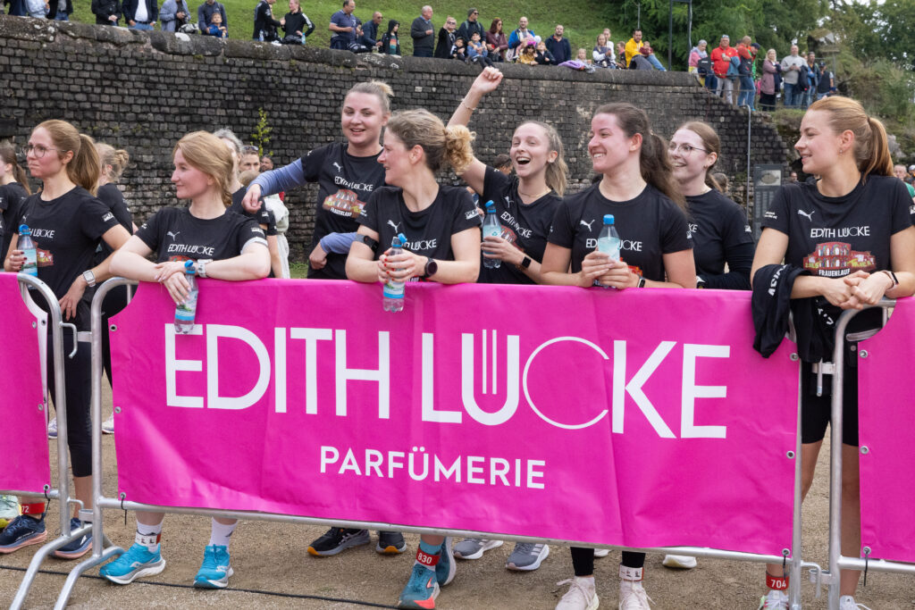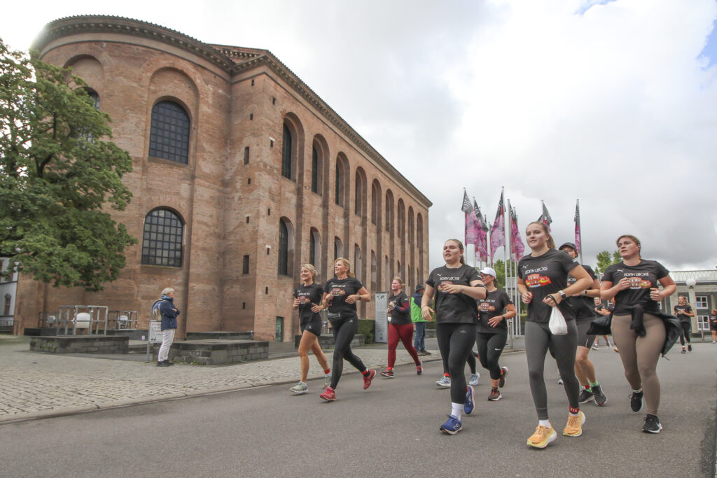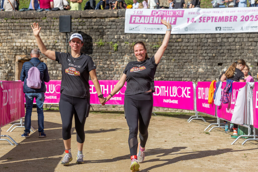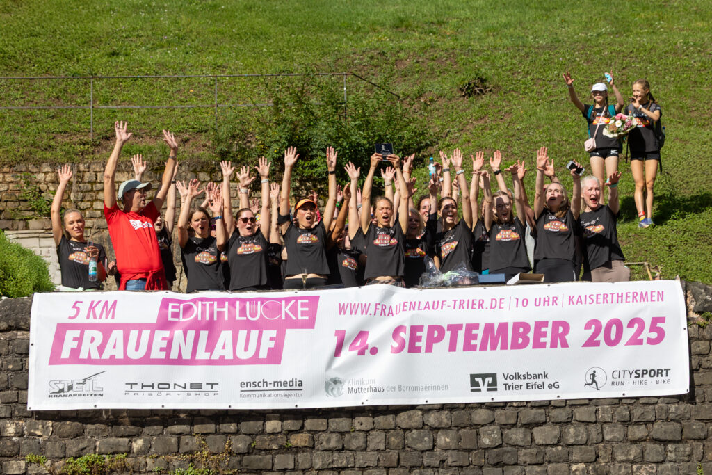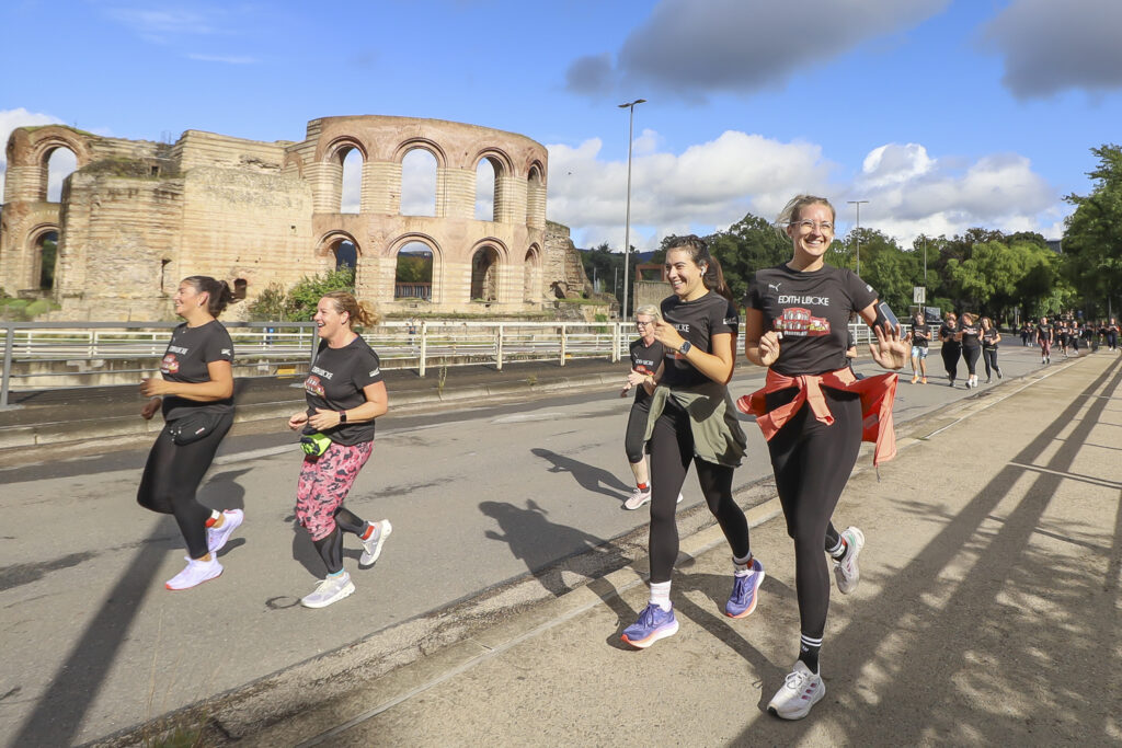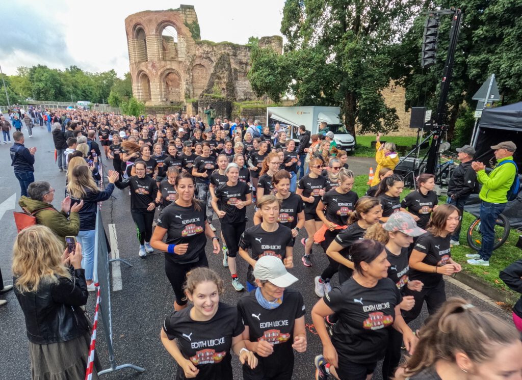 Gesa Krause und Olivia Gürth waren die prominenten Siegerinnen der Jahre 2023 und 2024 beim Edith Lücke-Frauenlauf – beide hatten genau wie die übrigen Teilnehmerinnen dieses in der Region Trier einzigartige Event in erster Linie als für sie seltenes Gemeinschaftserlebnis ohne jeden Leistungsdruck empfunden und die fünf Kilometer locker-flockig absolviert. Diesmal weilten die beiden Topathletinnen des Vereins Silvesterlauf Trier zeitgleich bei den Weltmeisterschaften in Tokio. Dazu später mehr. An diesem 14. September 2025 hätten Gesa und Olivia in ihrer sportlichen Heimat ihre wahre Freude gehabt: Schon beim Aufwärmen unter Anleitung der Trainerinnen von pulswerk Schweich herrschte an den Kaiserthermen schon vor dem Startschuss eine ausgelassene Atmosphäre. Mehr Frauen denn je (Melderekord: 962) – allesamt in schwarzen Laufshirts mit einer künstlerischen Abbildung des Römerbads – stimmten sich auf den Genusslauf vorbei an den touristischen Highlights der ältesten Stadt Deutschlands ein. „Vielen Dank, dass Ihr so zahlreich gekommen seid. Das ist großartig“, begrüßte Titelsponsorin Edith Lücke die Sportlerinnen. „Erzählt von Eurem Erlebnis“, ergänzte sie. „Nächstes Jahr schaffen wir die 1.000…“
