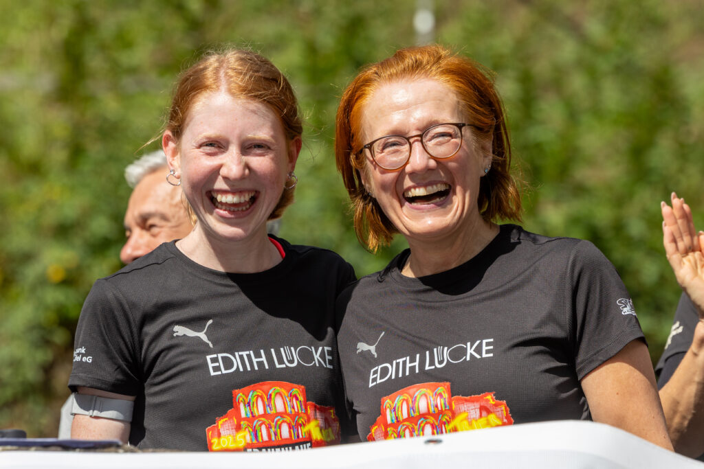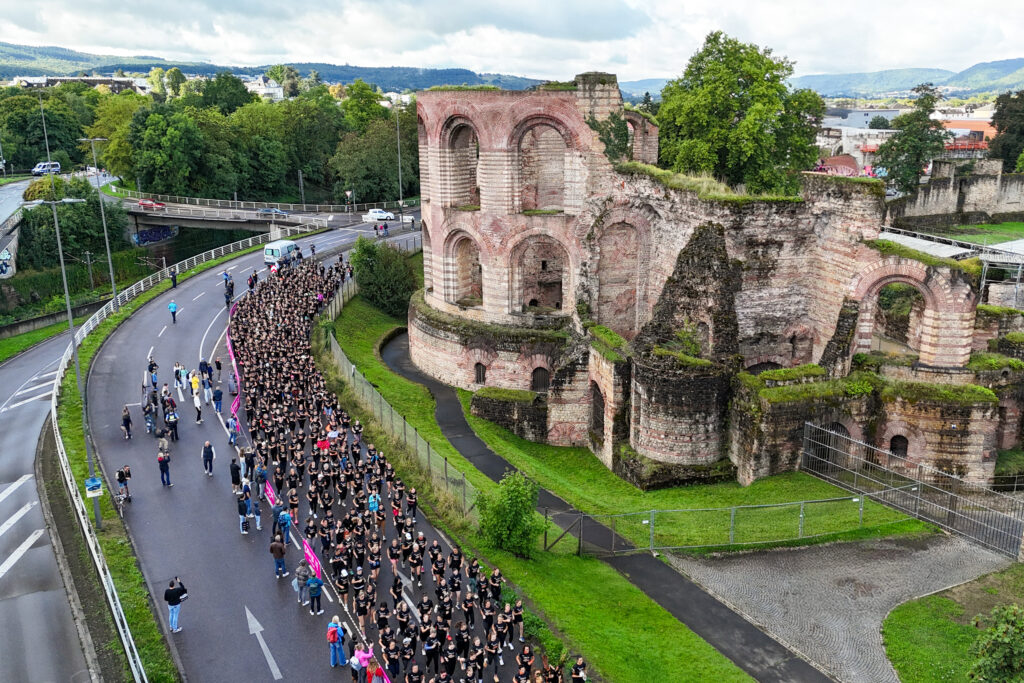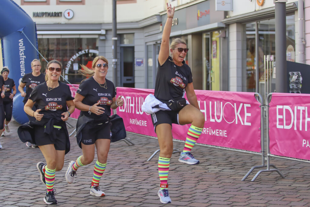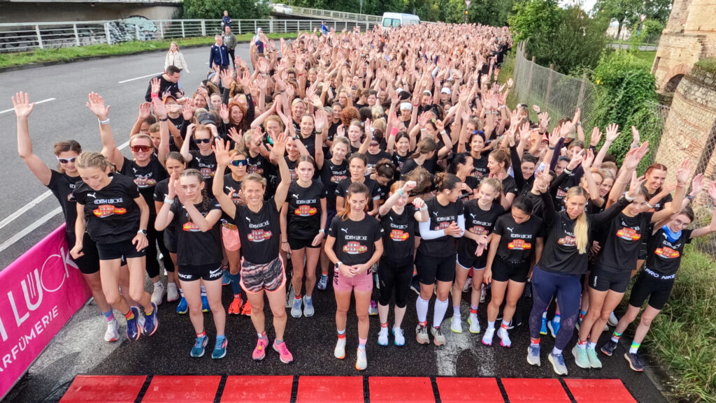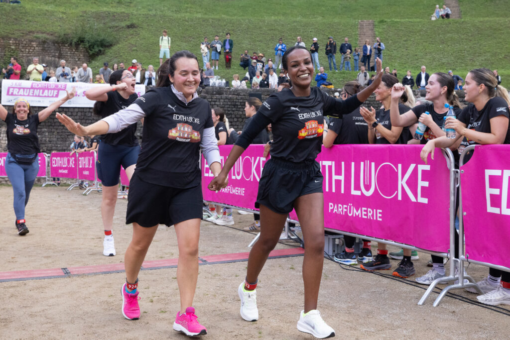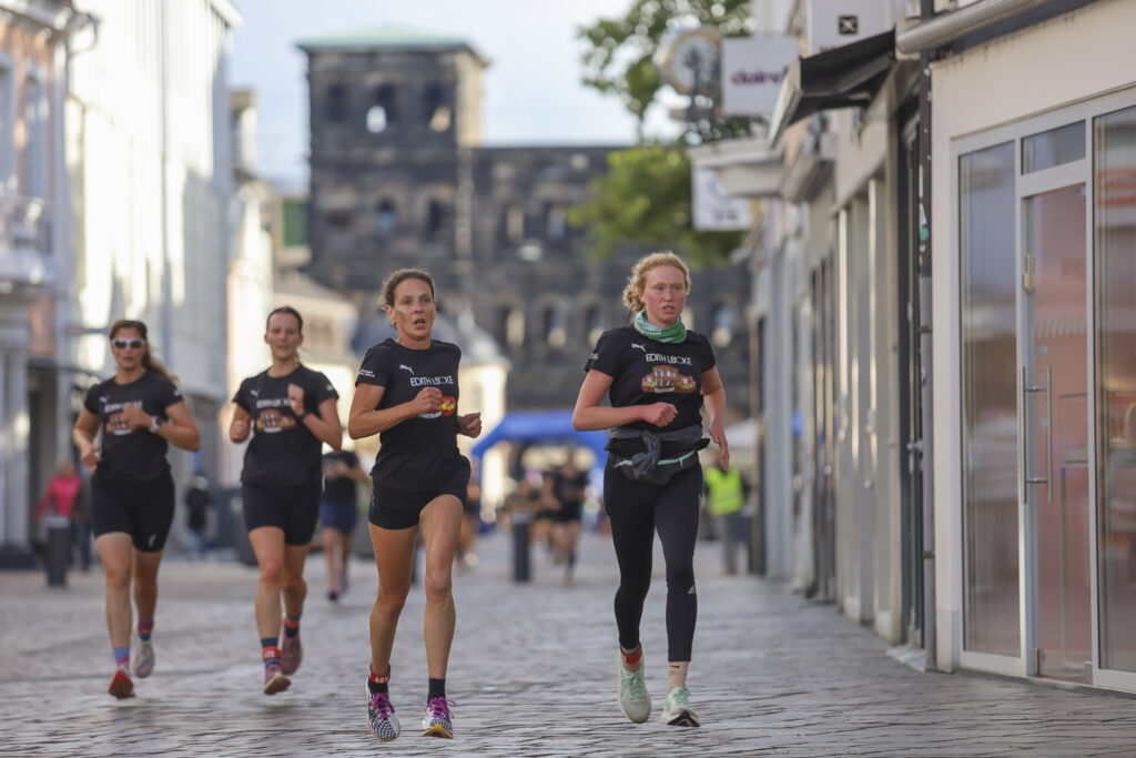 Gesa Krause und Olivia Gürth waren die prominenten Siegerinnen der Jahre 2023 und 2024 beim Edith Lücke-Frauenlauf – beide hatten genau wie die übrigen Teilnehmerinnen dieses in der Region Trier einzigartige Event in erster Linie als für sie seltenes Gemeinschaftserlebnis ohne jeden Leistungsdruck empfunden und die fünf Kilometer locker-flockig absolviert. Diesmal weilten die beiden Topathletinnen des Vereins Silvesterlauf Trier zeitgleich bei den Weltmeisterschaften in Tokio. Dazu später mehr. An diesem 14. September 2025 hätten Gesa und Olivia in ihrer sportlichen Heimat ihre wahre Freude gehabt: Schon beim Aufwärmen unter Anleitung der Trainerinnen von pulswerk Schweich herrschte an den Kaiserthermen schon vor dem Startschuss eine ausgelassene Atmosphäre. Mehr Frauen denn je (Melderekord: 962) – allesamt in schwarzen Laufshirts mit einer künstlerischen Abbildung des Römerbads – stimmten sich auf den Genusslauf vorbei an den touristischen Highlights der ältesten Stadt Deutschlands ein. „Vielen Dank, dass Ihr so zahlreich gekommen seid. Das ist großartig“, begrüßte Titelsponsorin Edith Lücke die Sportlerinnen. „Erzählt von Eurem Erlebnis“, ergänzte sie. „Nächstes Jahr schaffen wir die 1.000…“