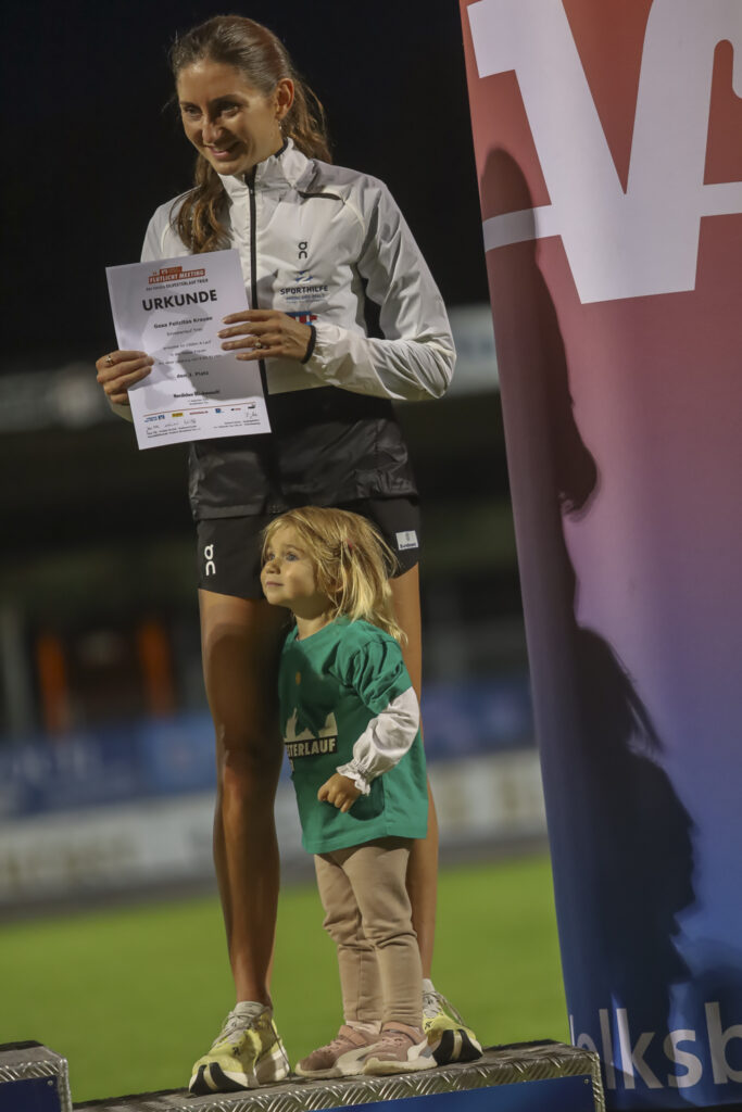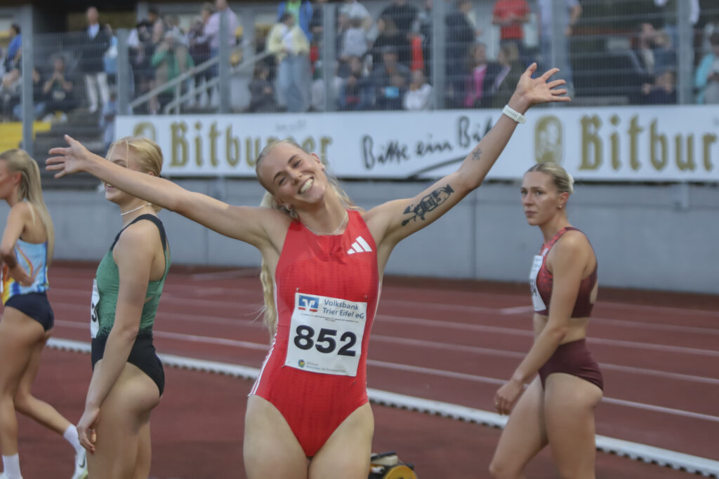 Zurück zum Flutlichtmeeting, das bei seiner 24. Auflage mit mehr als 500 Teilnehmern und 1.800 Zuschauern Rekordwerte erreichte: Erster emotionaler Höhepunkt war der Lux-Top-Inklusionslauf. Zur Filmmusik von „Chariots of fire“ („Die Stunde des Siegers“) liefen, walkten oder rollten 220 Aktive drei Runden über die rote Tartanbahn. Später steppte auf der gut gefüllten Haupttribüne des Moselstadions der Bär: Majtie Kolberg, Olympia-Halbfinalistin von Paris, sorgte über 800 Meter für einen deutschen Sieg und lief dabei in 1:59,52 ihre einzige Zeit des Jahres unter zwei Minuten. Gesa Krause strahlte auf dem Siegertreppchen mit Töchterchen Lola auf dem Arm, nachdem sie als 1500-Meter-Dritte ihre persönliche Bestzeit auf 4:04,91 Minuten gesteigert hatte. 800-Meter-Halleneuropameister Samuel Chapple (Niederlande) lief in der Weltklassezeit von 3:31,65 Minuten zum 1500-Meter-Sieg und U20-Weltmeister Andreas Halvorsen (Norwegen) warf sich nach 7:40,21 Minuten über 3000 Meter mit einer Hundertstelsekunde Vorsprung vor dem Polen Kamil Herzik ins Ziel.