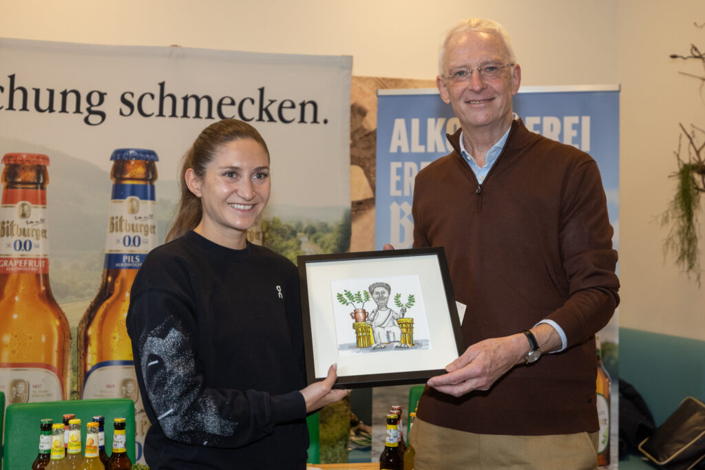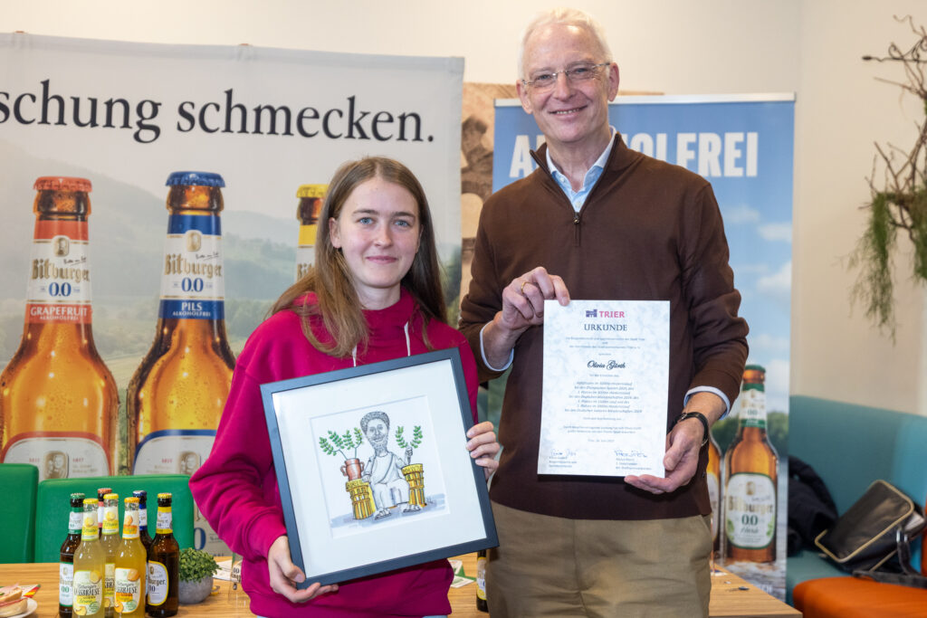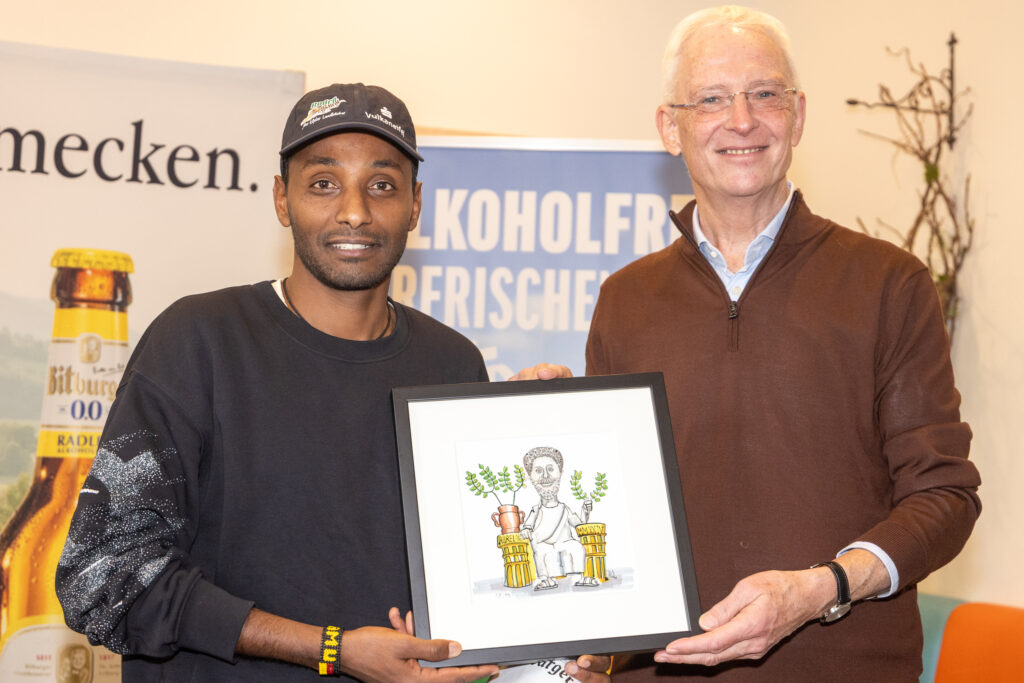 Trier liebt Samu: Als Zeichen der Wertschätzung erhielt der sympathische Marathoni aus den Händen von Oberbürgermeister eine Zeichnung des römischen Kaisers Marc Aurel. Den gleichen Druck aus der limitierten Auflage einer Zeichnung des Trierer Karikaturisten Roland Grundheber überreichte Leibe auch Gesa Krause und Olivia Gürth für ihre Trier-Botschafterleistungen im Jahr 2025.