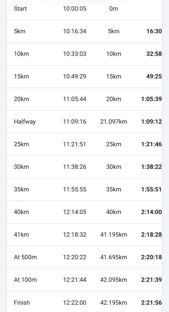 “Nächstes Mal werde ich die 2:20er Marke erneut attackieren”, versprach Seb, der sich am 15. Februar 2026 in Barcelona im Halbmarathon auf 66:08 Minuten gesteigert hatte. Eine Unterdistanzleistung, die eine “sub 2:20”-Zeit schon jetzt möglich erscheinen lässt. In Rotterdam lag Seb nach einer Halbmarathon-Zwischenzeit von 69:12 bis Kilometer 35 noch auf Kurs, bevor der sprichwörtliche “Mann mit dem Hammer” ihm eins verpasste. Die Folge: Nach ausnahmslos “16er” Fünf-Kilometer-Splits bis zur 30-km-Marke (zwischen 16:07 und 16:36) sackte Seb auf 17:29 Minuten (30 bis 35) und 18:09 Minuten (35 bis 40) ab. Für Kilometer 41 benötigte er 4:28 Minuten. (siehe Rennbilanz)